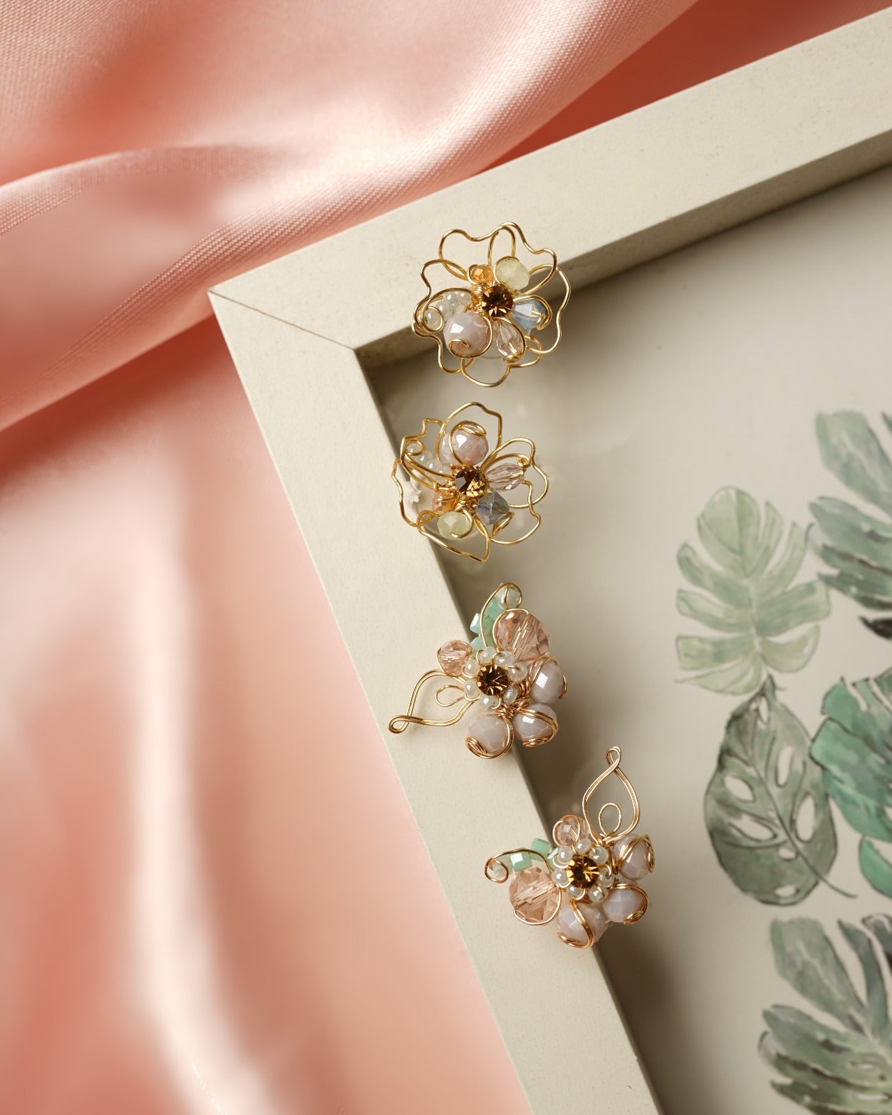 Arete en forma de flor de loto, con baño en plata, zirconesy cristales de murano.